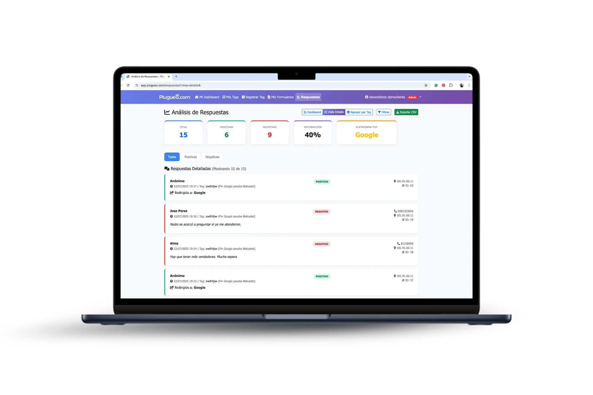 Todos los formularios enviados llegan claramente a su panel de control además de llegar en forma inmediata vía email. Aquí podrá conocer fácilmente la satisfacción del cliente y tomar medidas inmediatas cuando sea necesario.